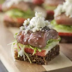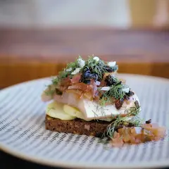 - Sild marineret i fynsk Ingrid Marie brændevin med æble/løgkompot, peberrodscreme og sprødt rugbrød